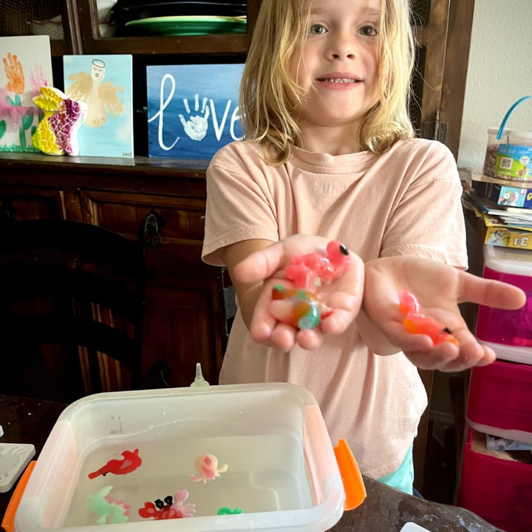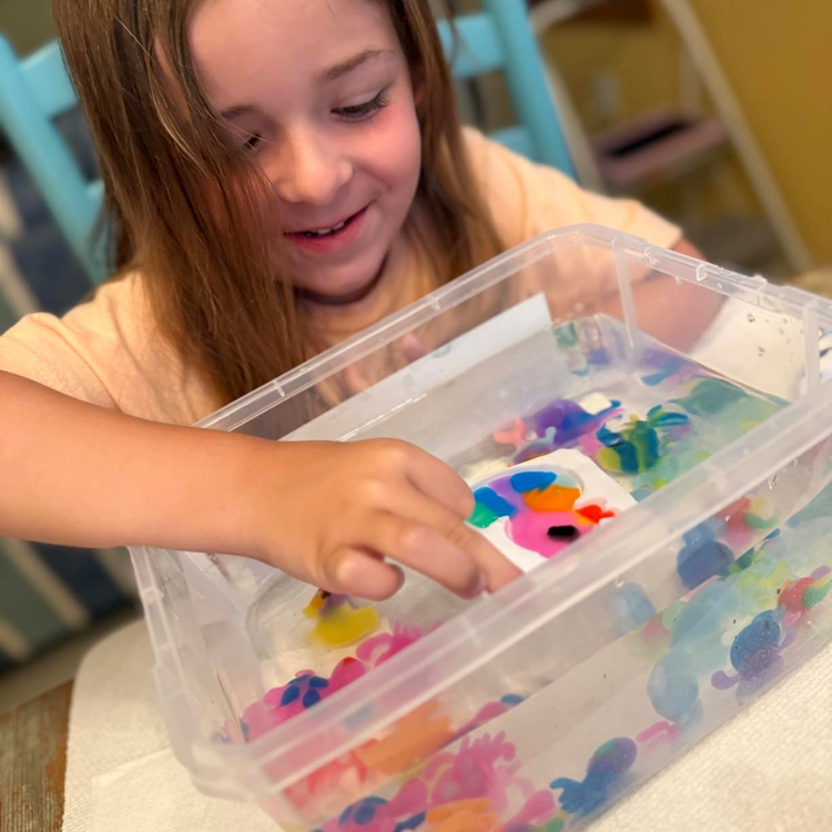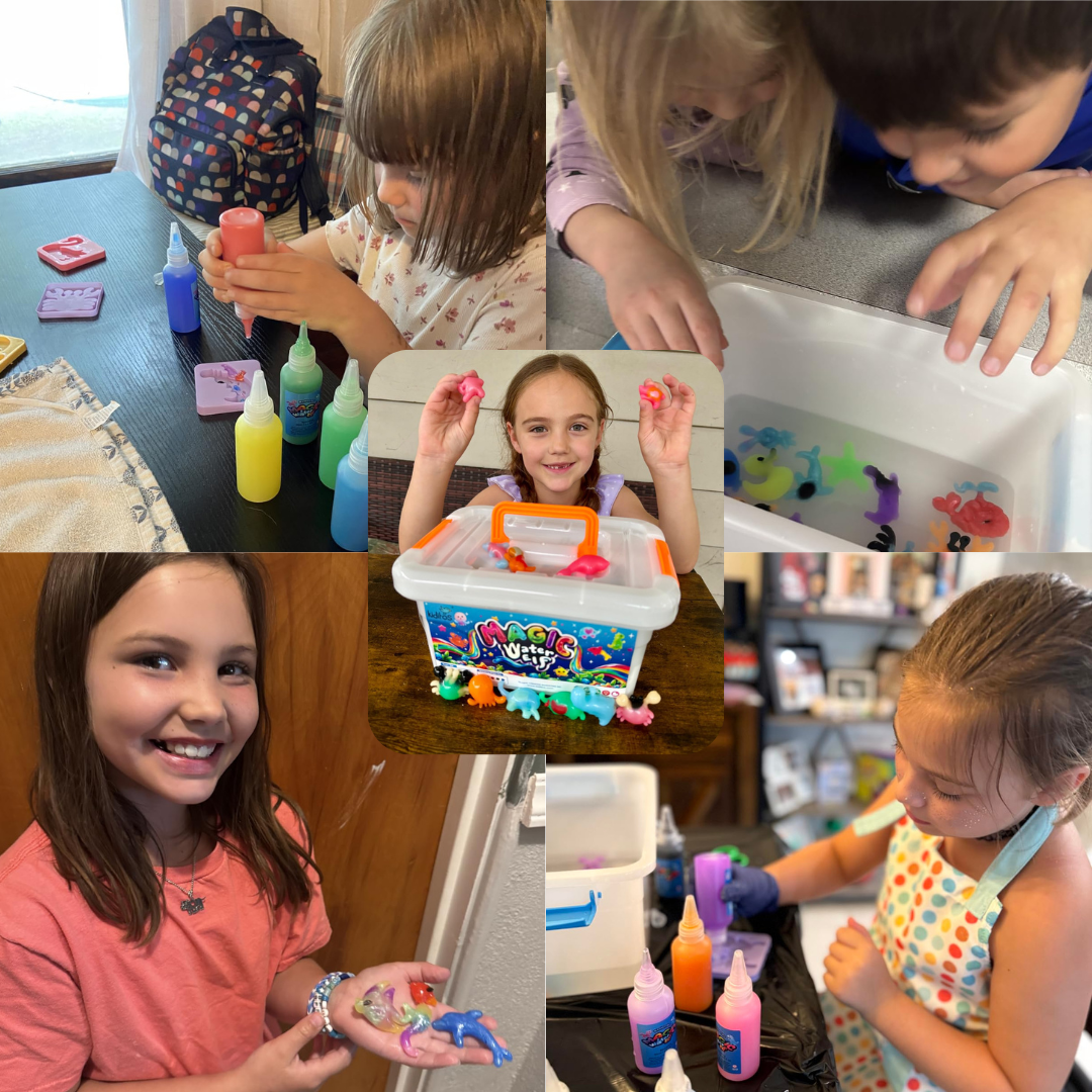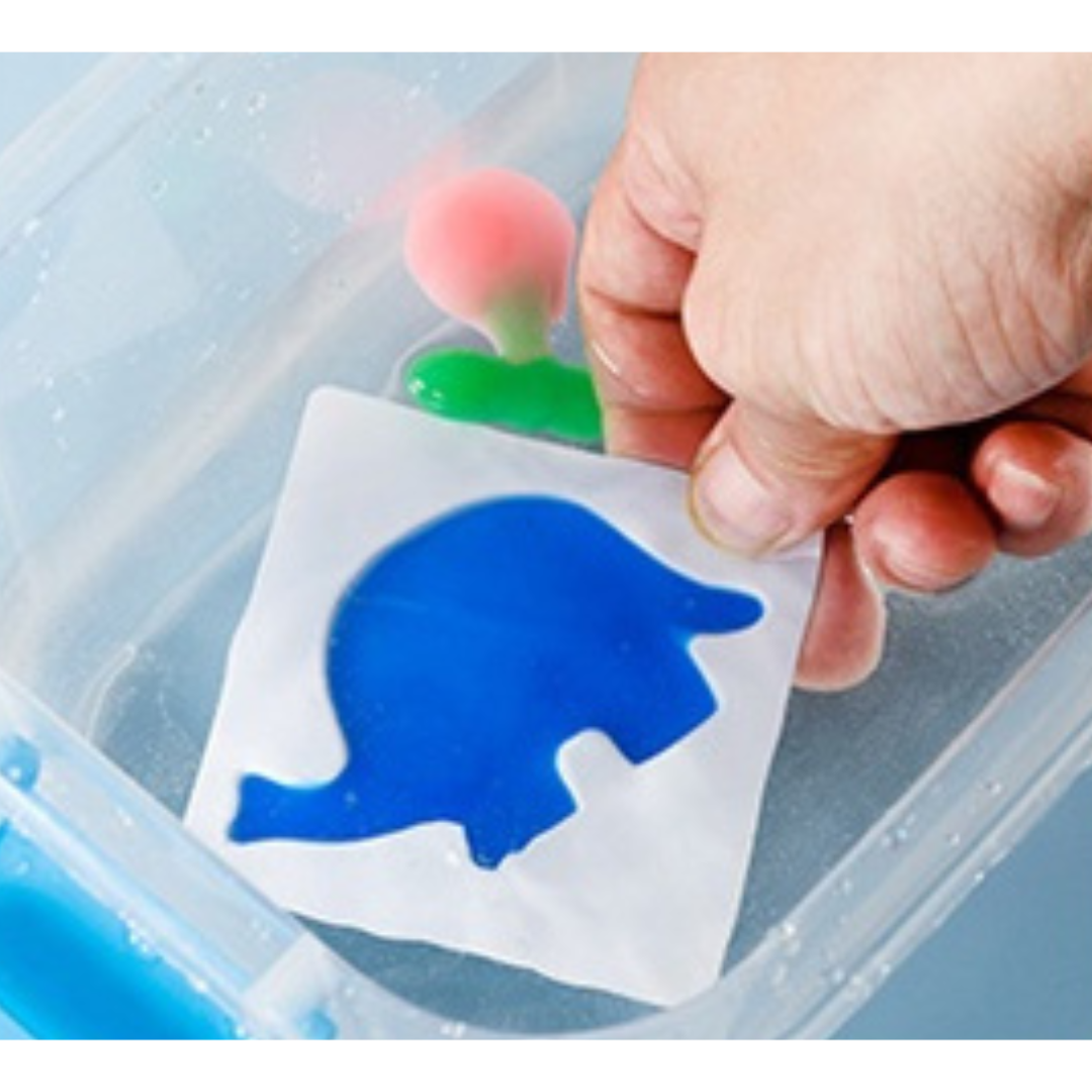 It’s a hands-on creative activity where kids design colourful 3D water creations that magically form when placed in a special solution. It combines creativity, curiosity, and play into one exciting experience.